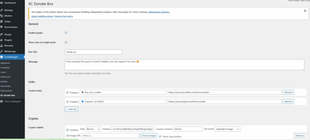 KC Donate Box blendet nach deinen Beiträgen eine kleine, hübsche Spendenbox ein – mit frei konfigurierbaren Links (z. B. Buy me a coffee, PayPal) sowie mehreren Krypto-Wallets inkl. QR-Code. Keine Spielereien, kein Tracking, einfach und schnell.