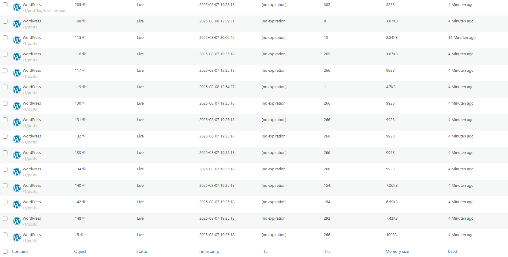 Nach der Installation kannst du im Admin-Panel genau sehen, welche Daten wie oft zwischengespeichert werden – inklusive Objektgröße und Speicherzeit.